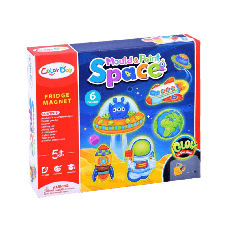 Acest set dezvolta creativitatea, indemanarea si atentia copiilor. Setul contine: 1 matrita cu 6 forme diferite pentru crearea figurinelor (planeta cu inele, Terra, rachete si 2 astronauti) 6 culori acuarele acrilice 1 pensula 1 recipient pentru mixarea prafurilor si formarea kit-ului. 1 pungute pudra( ipsos) folie magnetica autoadeziva. Daca se pastreaza in cutie, curata, matrita pentru turnare poate fi refolosita de multe ori Mod de folosire: - se toarna apa rece in recipient - se presara ipsos peste apa pana cand acesta depaseste nivelul apei - se amesteca continutul cu ajutorul spatulei, pana cand intregul continut devine o pasta omogena, asemanatoare smantanei - turnati amestecul in forma si miscati putin pentru a iesi bulele de aer - in cazul cand ati preparat putin amestec, nu completati cu apa; turnati si repetati alt amestec - cand amestecul turnat s-a racit, se poate scoate din forma - se finiseaza pe margini - forma din plastic se spala cu apa si se lasa la uscat, se depoziteaza in locuri ferite de caldura - forma turnata se lasa la uscat timp de 24-48 de ore (intr-un spatiu ventilat, in pozitie verticala) si apoi se poate picta. Varsta recomandata: minim 6 ani Dimensiuni ambalaj 23cm x 27 cm x 5 cm, 282 grame Atentie! Acest joc nu este recomandat copiilor sub 3 ani. Pentru copiii de peste 3 ani recomandam utilizarea lui sub supravegherea unui adult.