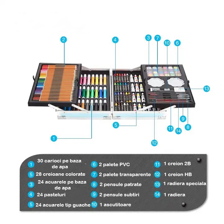 Pastrati-va toate materialele de arta intr-un singur loc . Acest set de arta de premiera are 145 de piese, creioane colorate, markere si hartie de desen, toate organizate intr-o cutie de depozitare durabila pe care o poti aduce cu tine.
