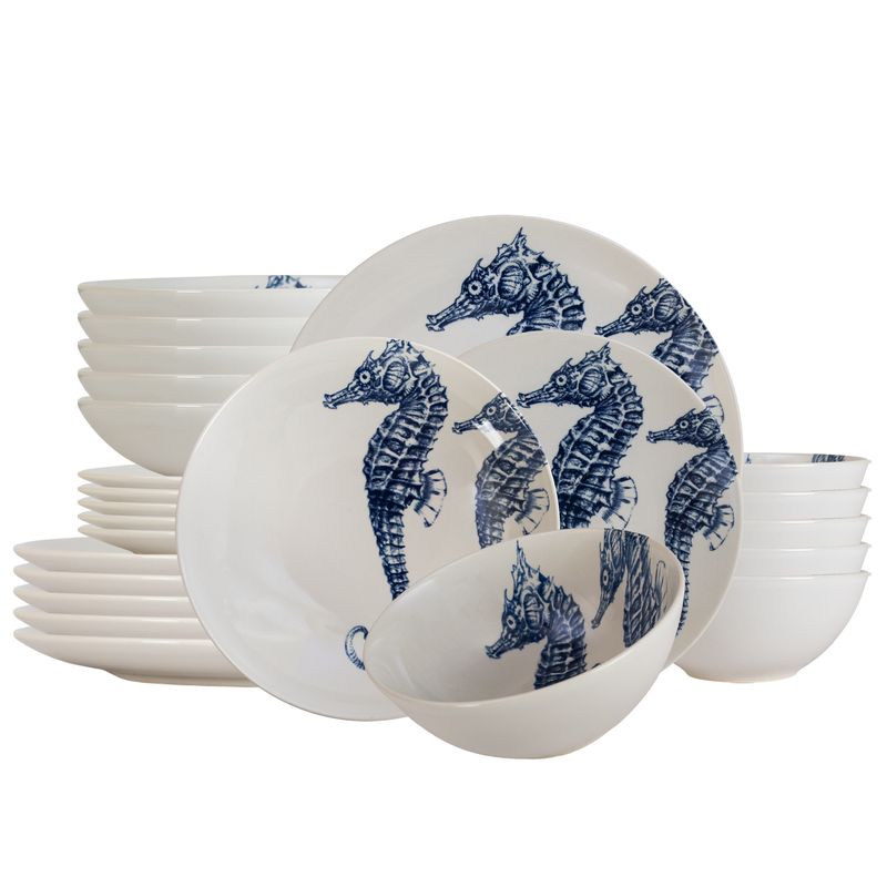 Set farfurii 24 piese, pentru 6 persoane, Valuri Marine, Cesiro, Alb decor cai de mare