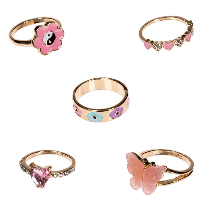 Set inele copii, model fluture, floare, inimioare, multicolor, 5 bucati Set inele copii, model fluture, floare, inimioare, multicolor, 5 bucati