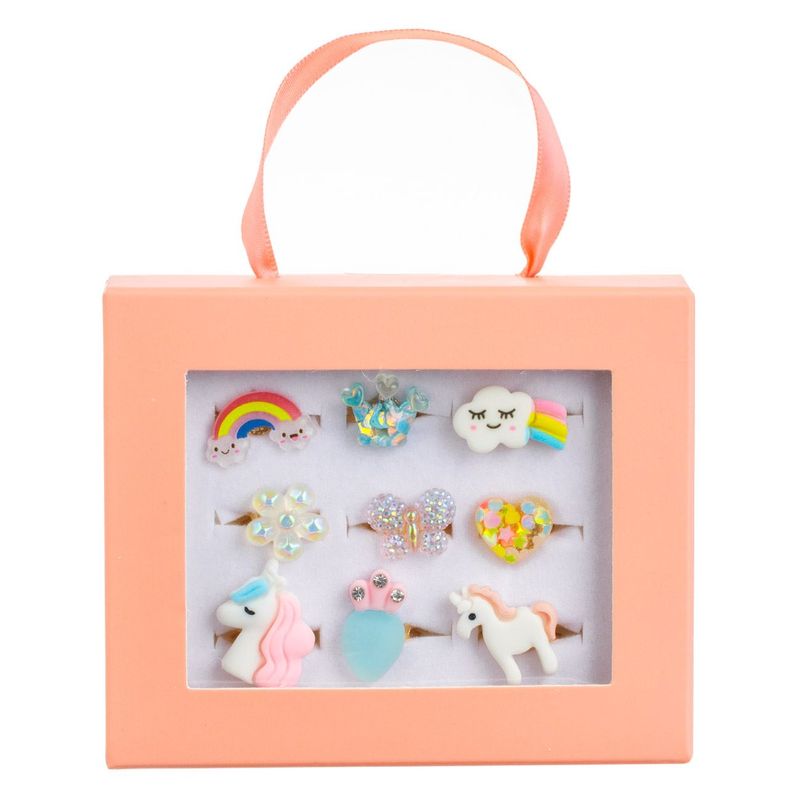 Set inele, model unicorn, 9 bucati, multicolor, cutie roz pudra pentru copii Set inele, model unicorn, 9 bucati, multicolor, cutie roz pudra pentru copii