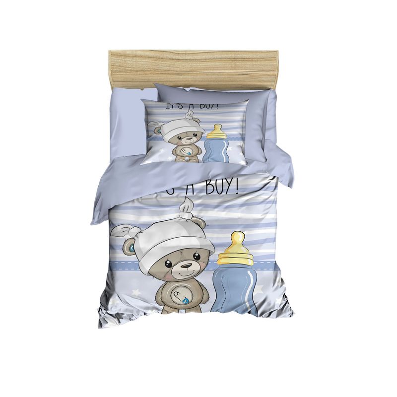 Partea superioară a cuverturii de plapumă și a feței de pernă este realizată din microsatină 100% poliester, asigurând o atingere mătăsoasă și fină pe care bebelușul dvs. o va adora. Partea inferioară este confecționată din bumbac 100%, asigurând respirabilitate și confort maxim.