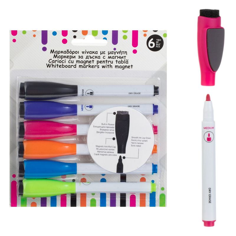 Set markere whiteboard, 6 buc, varf subtire, burete incorporat, magnet, multicolor Set markere whiteboard, 6 buc, varf subtire, burete incorporat, magnet, multicolor