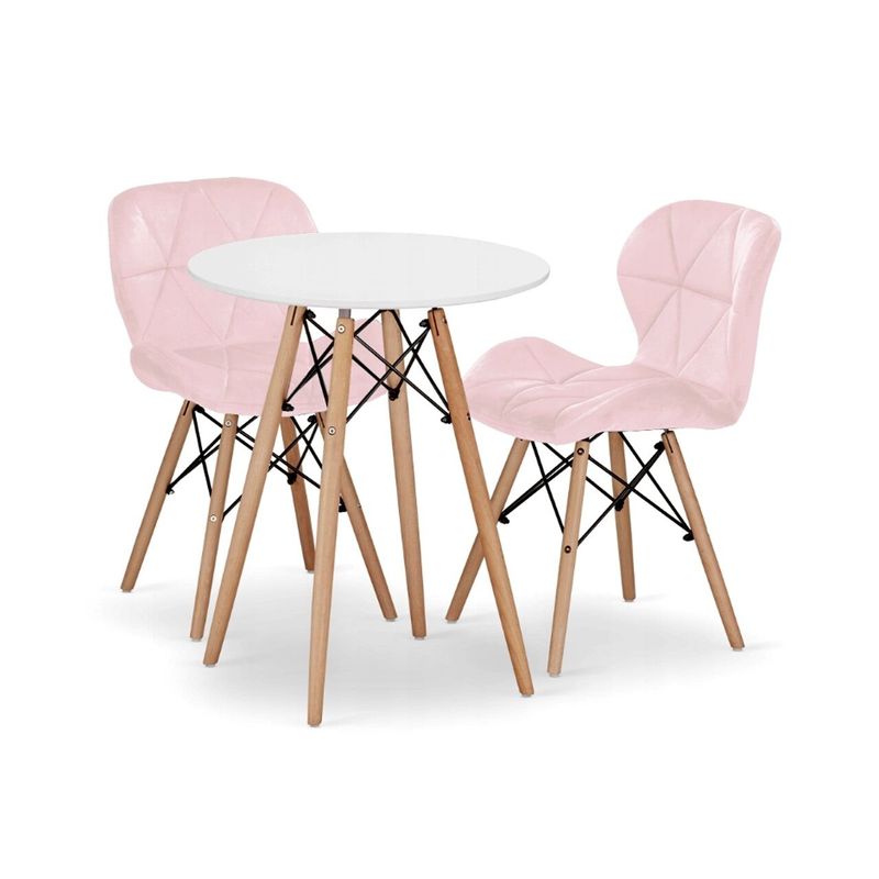 Set masa rotunda stil scandinav + 2 scaune Lago catifea, Artool, MDF si lemn, alb si roz, 60x72 cm