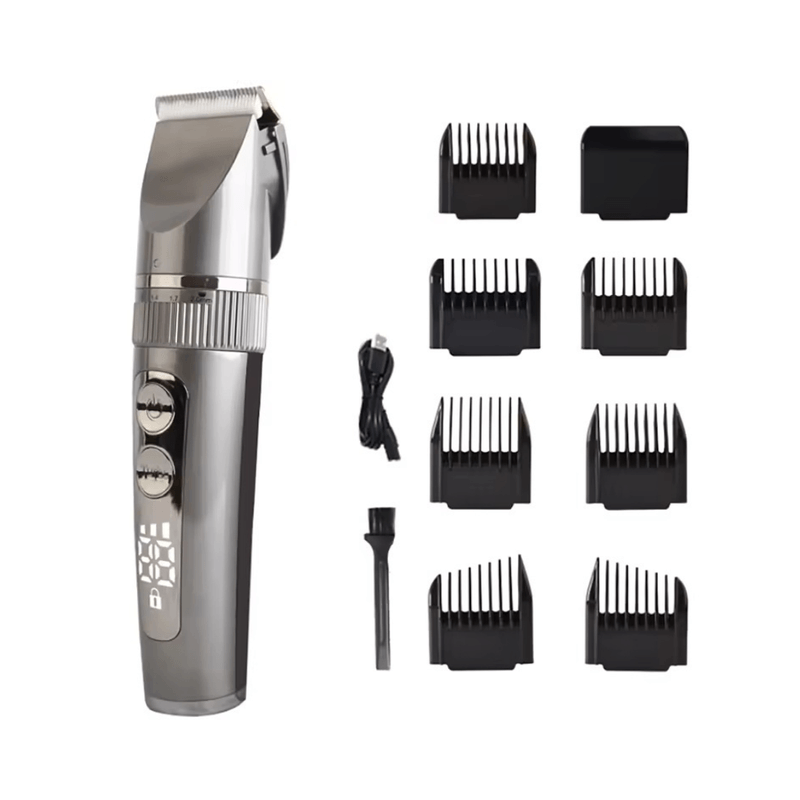 Set Masina de Tuns, Afisaj LED, Turbo, 5 Nivele de Reglare a Lungimii, Rezistenta la Apa, 200 min Autonomie, Argintiu Set Masina de Tuns, Afisaj LED, Turbo, 5 Nivele de Reglare a Lungimii, Rezistenta la Apa, 200 min Autonomie, Argintiu