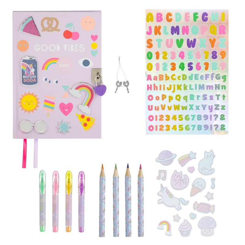 Carti si BiroticaRechiziteAlte accesorii scolareSet papetarie, good vibes, 11 bucati, culoare lila, 64 pagini, autocolante, pixuri si creioane colorate