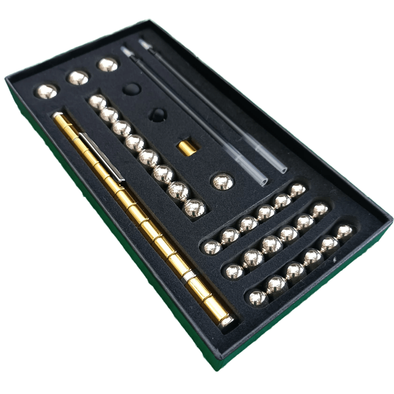 Doua capete de stilou, pot fi folosite ca stilou cu gel, stilou cu ecran tactil, 14 bucati inele magnetice, 30 bucati bile de otel si cutie cadou.