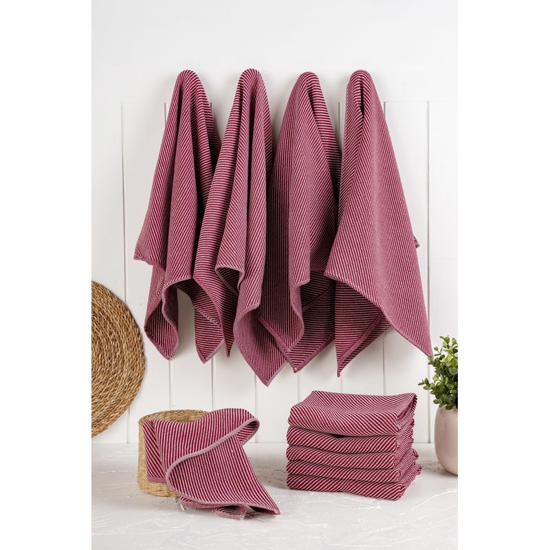 Setul nostru de prosoape de bucătărie vine într-o frumoasă culoare roșu claret, care va înveseli instantaneu decorul bucătăriei dvs. Fie că uscați vasele, ștergeți blaturile sau manevrați oale și cratițe fierbinți, aceste prosoape vor adăuga o notă de stil rutinei dvs. zilnice.