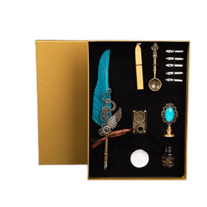 Set stilou cu pana culoare albastra cu ornamente metalice, Ceara pentru Sigiliu, Stampila, Lingurita, 5 Penite si Suport Set stilou cu pana culoare albastra cu ornamente metalice, Ceara pentru Sigiliu, Stampila, Lingurita, 5 Penite si Suport