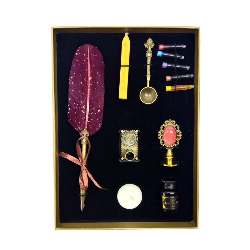 Set stilou cu pana rosie, Ceara pentru Sigiliu, Stampila, Lingurita, 5 Penite si Suport Set stilou cu pana rosie, Ceara pentru Sigiliu, Stampila, Lingurita, 5 Penite si Suport