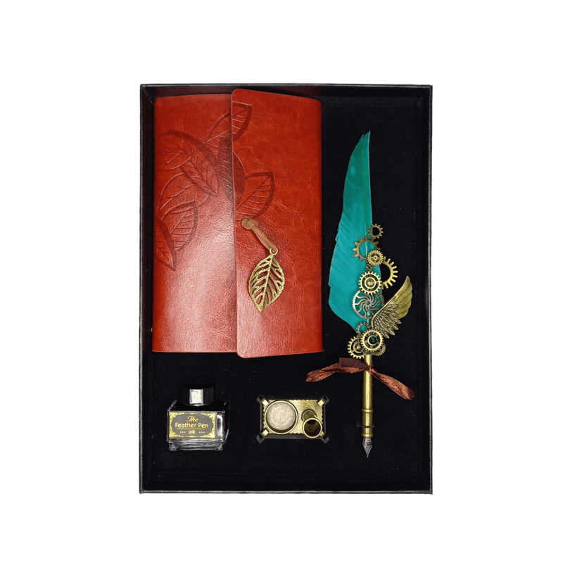 Set stilou cu pana verde cu ornamente metalice, agenda, calimara si suport de birou Set stilou cu pana verde cu ornamente metalice, agenda, calimara si suport de birou