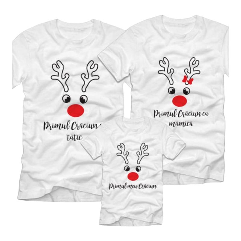 Set tricouri de Craciun, albe, de familie, 3 membrii, "Primul nostru Craciun" Set tricouri de Craciun, albe, de familie, 3 membrii, "Primul nostru Craciun"