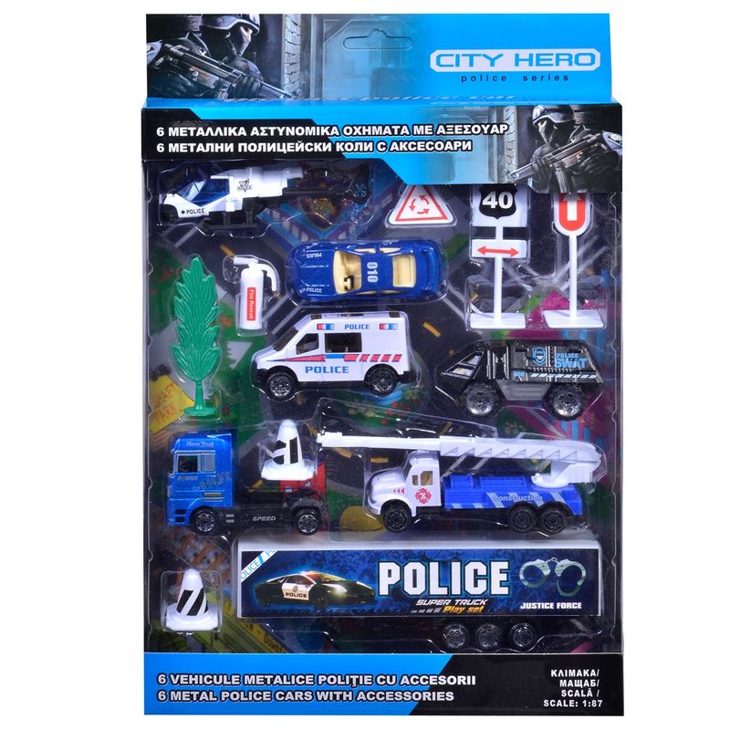 Set vehicule jucarie, model city hero, scara 1:87, 6 bucati metalice cu accesorii, multicolor Set vehicule jucarie, model city hero, scara 1:87, 6 bucati metalice cu accesorii, multicolor
