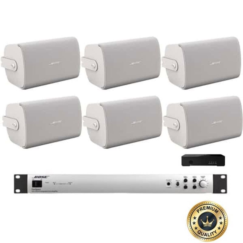Set pentru sonorizare in sistem 100V, discret, de la brandul Bose pentru restaurante hoteluri, sali de fitness si cafenele. Pentru suprafete de pana la 170mp, impartit in 2 zone cu volum reglabil.