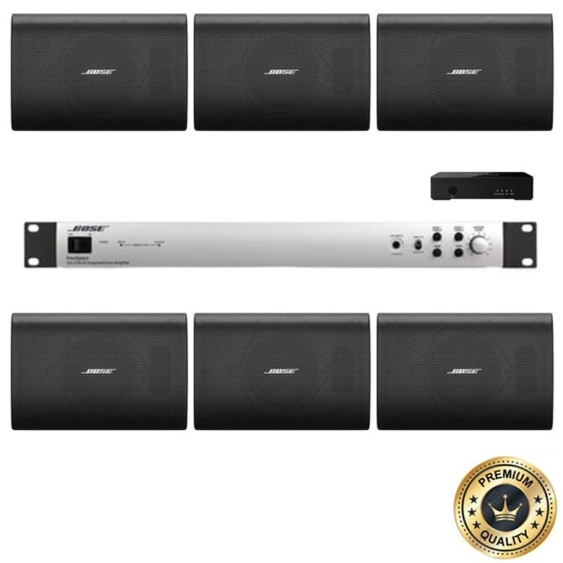 Set pentru sonorizare in sistem 100V, discret, de la brandul Bose pentru restaurante hoteluri, sali de fitness si cafenele. Pentru suprafete de pana la 130mp, impartit in 2 zone cu volum reglabil.
