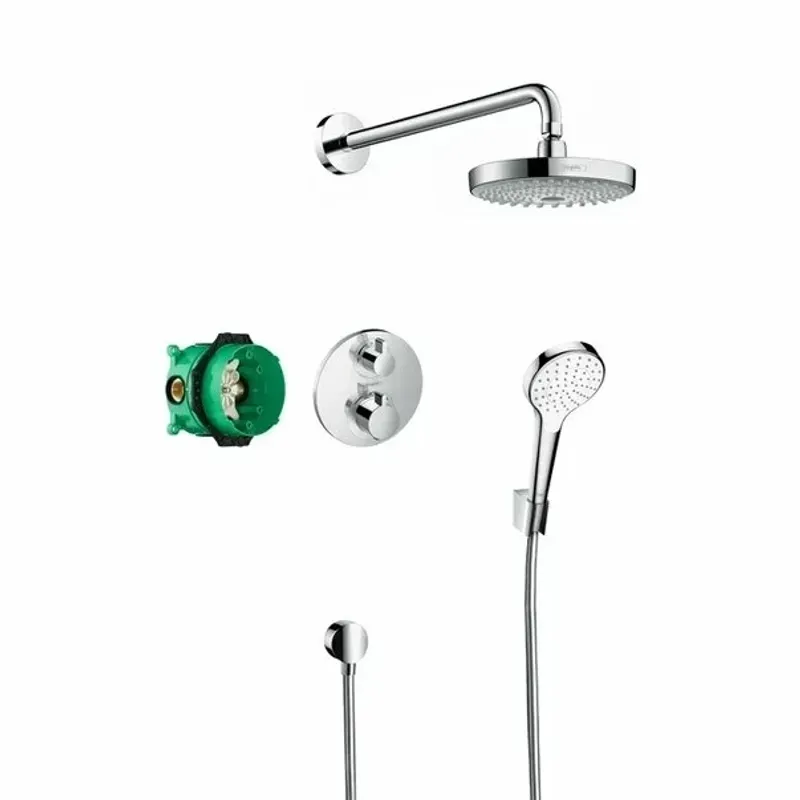 Sistem de dus incastrat Hansgrohe Croma Select S Ecostat S crom lucios Detalii Sistem de dus incastrat Hansgrohe Croma Select S Ecostat S crom lucios Panelurile de dus Hansgrohe Croma sunt placut de folosit, au un design modern si ergonomic si o tehnologie de ultima ora. Iti ofera o experienta de dus memorabila la un pret accesibil. Una dintre primele colectii Hansgrohe, Croma are un design perfectionat periodic, fiind updatata mereu cu ultimele detalii inovative. Gama Croma are forme rotunjite cu margini finisate, placute la atingere. Coloana de dus Croma este usor de montat, rezistenta si are un design suplu. Se potriveste in baile moderne, si are atat posibilitatea de a folosi palaria de dus pentru un sentiment de ploaie relaxant, cat si para de dus pentru revigorare rapida. Seturile pentru dus Hansgrohe Croma sunt variate, poti alege intre bateriile termostatate sau cu monocomanda, dar si intre diferite tipuri de schimbare a jetului de apa. Ultima inovatie in acest sens este gama Select. Coloanele de dus Croma Select presupun prezenta unui buton actionabil pe para de dus prin care ai la dispozitie mai multe stiluri de jet cum ar fi tip Rain si IntenseRain. Ecostat este gama de baterii pentru cada si dus termostatate. Sunt create de Hansgrohe pentru a oferi un plus de confort fiecarei utilizari. Au un design fluid si o structura moderna si se potrivesc cu usurinta in orice ambient de baie. Bateriile Ecostat pot fi o aditie pentru oricare dintre seturile de baterii Hansgrohe. Specificatii Sistem de dus incastrat Hansgrohe Croma Select S Ecostat S crom lucios: Producator: Hansgrohe Colectia: Croma Select, Ecostat Tip produs: sistem de dus Tip montare: incastrat Tip actionare: termostatata Culoare: crom Finisaj: lucios Material: alama sanitara Numar consumatori: 2 Dimensiune cap de dus: 187x187 mm Palarie dus cu jet tip spray: Rain, IntenseRain Dus manual cu tip pulverizare: Ploaie Debit maxim la 3 bar: 17 l/min Conectorul pivotant previne incurcarea furtunului Max. presiune de lucru: 6 bar Setul include: Baterie cada si dus termostatica Ecostat cu 2 functii Corp incastrat pentru montaj IBox universal Palarie dus fix Croma Select S 180 mm cu 2 tipuri de pulverizare Brat de dus 389 mm Para de dus Croma Select S cu 1 tip de pulverizare Conector FixFit de dus fara valva non-retur Furtun dus Isiflex 1250 mm Suport de dus Porter S Quick Clean Curatare simpla si eficienta a sistemelor de dus si a aeratoarelor datorita duzelor elastice de silicon. Murdaria, calcarul si/sau orice alte substante se curata simplu, doar prin frecarea usoara a duzelor. Te poti bucura astfel de un dus perfect pentru mai mult timp dar si de baterii de baie mai curate si mai eficiente. XXL Performance Dimensiunile parei sau palariei de dus influenteaza in mod direct confortul dusului. Parele si palariile de dus cu diametrul cuprins intre 100 si 600 mm asigura o performanta de exceptie. Combinate cu diverse tipuri de jeturi inovatie Hansgrohe, apa ne invaluie mai abundent, sporind sentimentul de bunastare. Baie Sisteme de dus Sisteme de dus incastrate Vezi mai mult