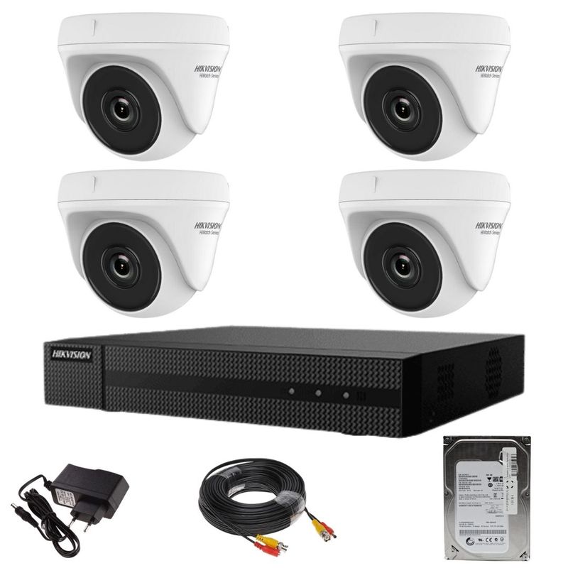 Kit de supraveghere 4 camere Hikvision seria HiWatch, DVR 4 canale cu accesorii incluse si HDD 500 GB