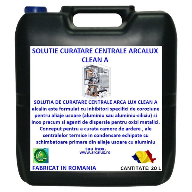 SOLUTIA DE CURATARE CENTRALE ARCA LUX CLEAN A alcalin este formulat cu inhibitori specifici de coroziune pentru aliaje usoare (aluminiu sau aluminiu-siliciu) si inox precum și agenti de dispersie pentru oxizi metalici.