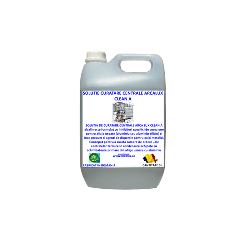 SOLUTIA DE CURATARE CENTRALE ARCA LUX CLEAN A alcalin este formulat cu inhibitori specifici de coroziune pentru aliaje usoare (aluminiu sau aluminiu-siliciu) si inox precum și agenti de dispersie pentru oxizi metalici.