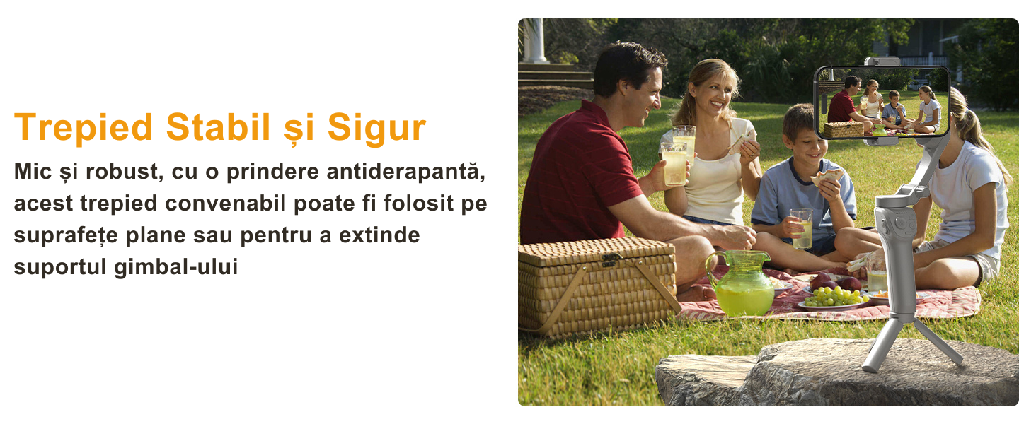 Conceput cu un strat rezistent la pete si o textura anti-alunecare, manerul ergonomic asigura o prindere sigura a gimbalului. In plus, este compatibil cu Android 9.0 si versiuni ulterioare, si iOS 11 si versiuni ulterioare, fiind un instrument versatil pentru toti utilizatorii de smartphone-uri.