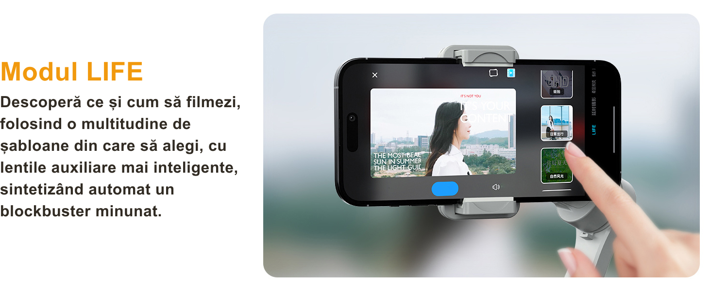 Descopera posibilitati creative nelimitate cu aplicatia noastra Gimbal Show! Comuta usor intre diverse moduri de filmare, inclusiv LIFE Mode, Gesture Control, Panorama, Dyna-Zoom si Time-lapse. In plus, poti optimiza setarile camerei native ale telefonului pentru rezultate si mai bune.