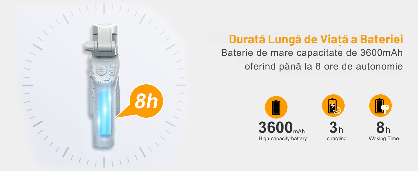 - Durata de viata extinsa a bateriei: Cu o capacitate de 3600mAh, gimbalul ofera pana la 8 ore de filmare continua. Este ideal pentru vlogging, streaming live, sau capturarea fiecarui detaliu din aventurile tale de zi cu zi.