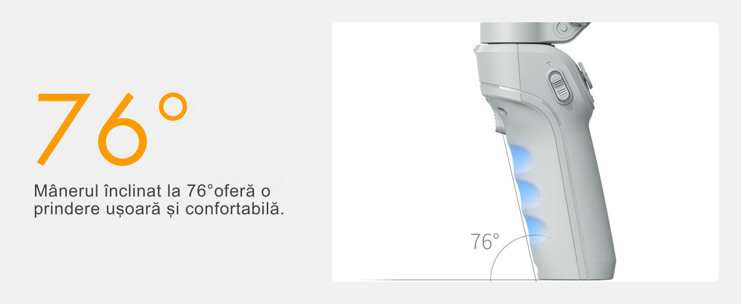 - Design ergonomic si portabil: Proiectat pentru a se potrivi confortabil in mana ta, cu un maner inclinat la 76° si o greutate de doar 378g, acest gimbal este usor de transportat oriunde ai merge.