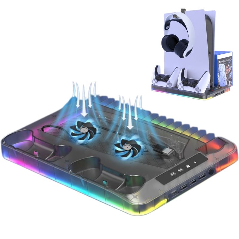 Transforma-ti experienta de gaming cu acest stand inteligent, proiectat special pentru consola PS5 Slim si PS5 (versiune digitala si cu disc). Design modern cu iluminare RGB, racire duala si incarcare simultana pentru doua controllere – totul intr-un singur loc!