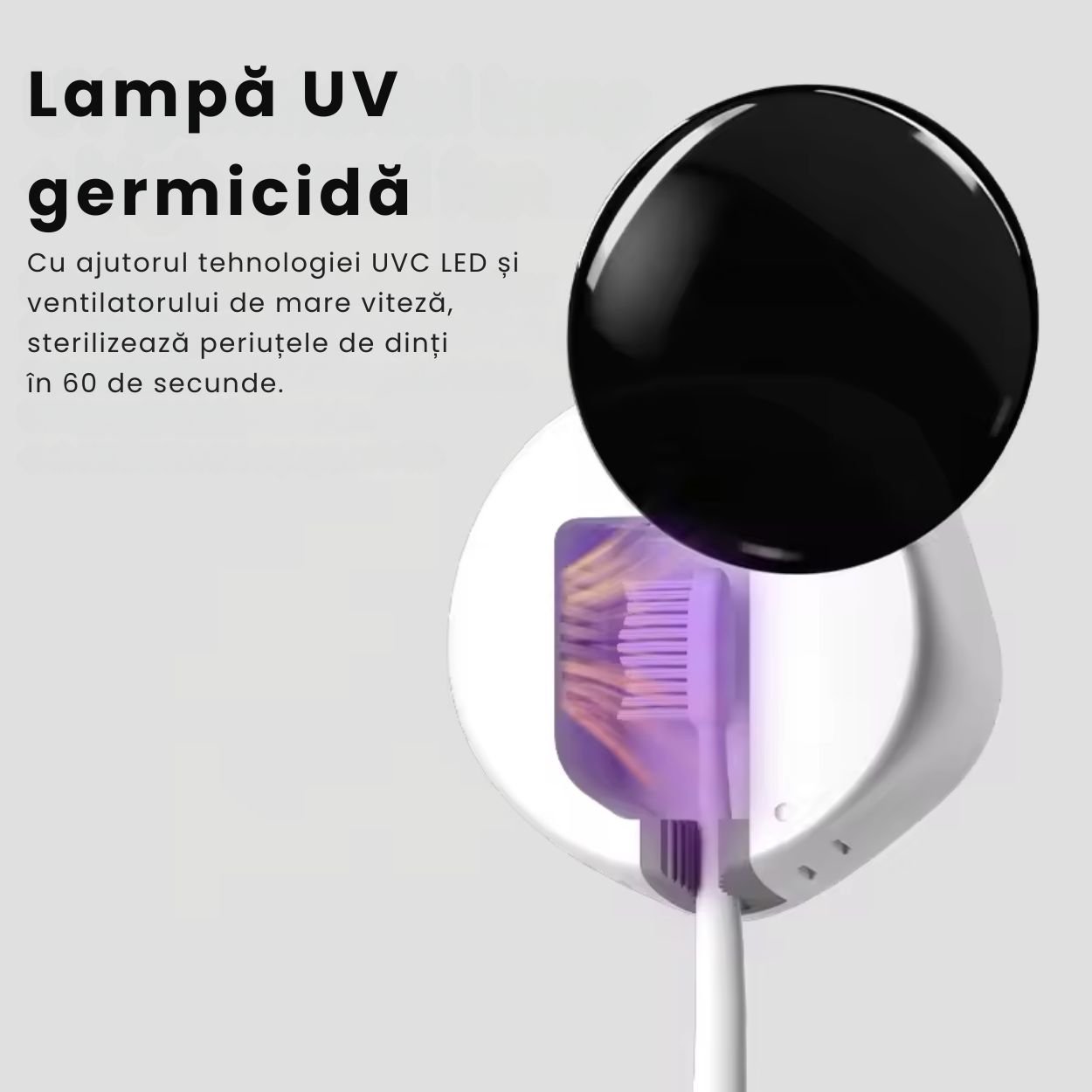 Lampa UV germicida elimina eficient bacteriile si germenii, sterilizand periutele de dinti in doar 60 de secunde. Acest proces rapid este asigurat de tehnologia UV-C care distruge microorganismele daunatoare.