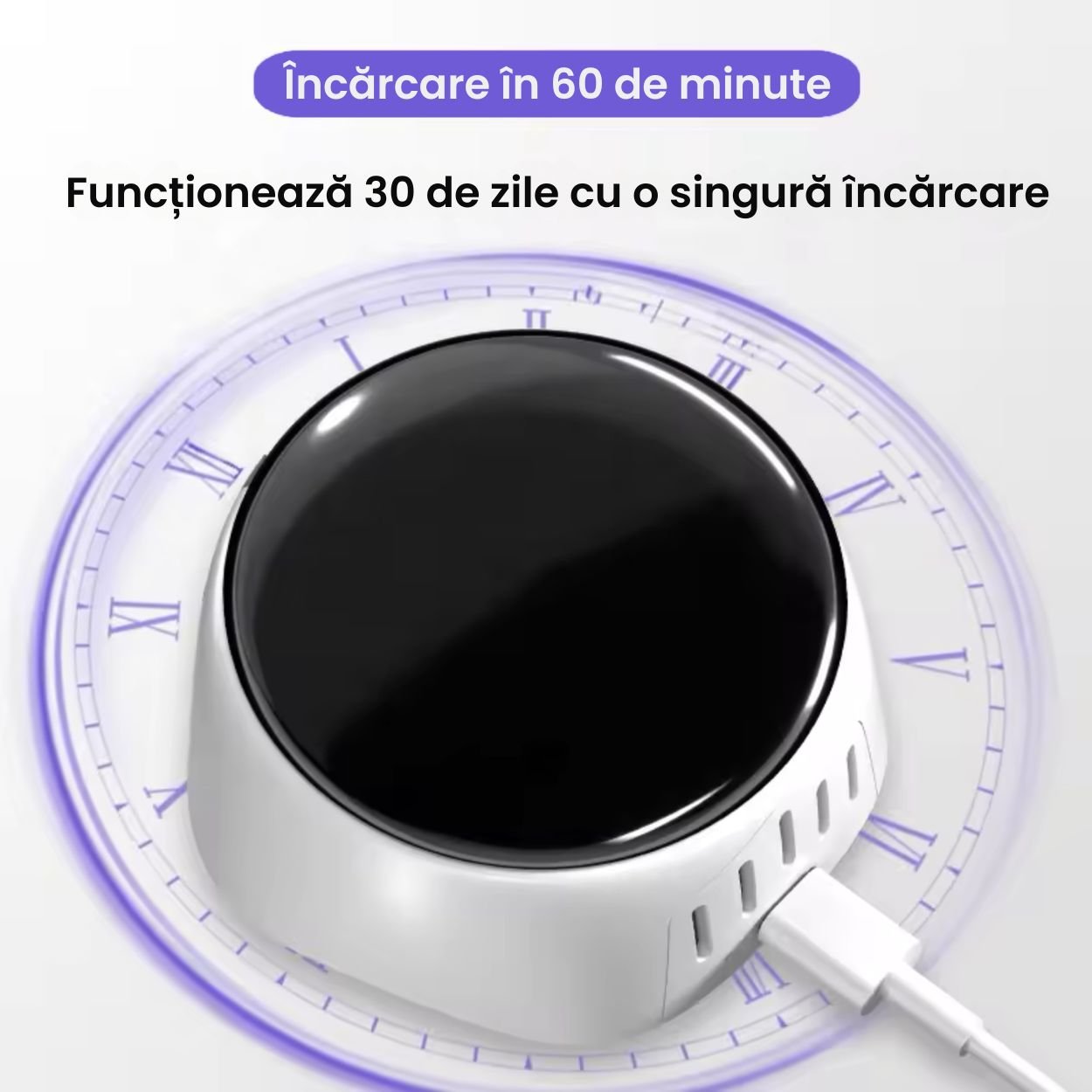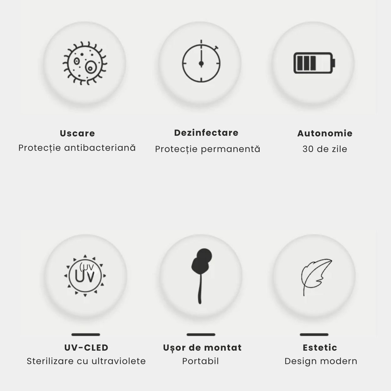 Sterilizatorul este echipat cu un acumulator care se incarca rapid prin USB Type-C in doar 60 de minute, oferind o autonomie de pana la 30 de zile cu o singura incarcare. Acest lucru face ca dispozitivul sa fie extrem de practic si convenabil pentru utilizare zilnica.