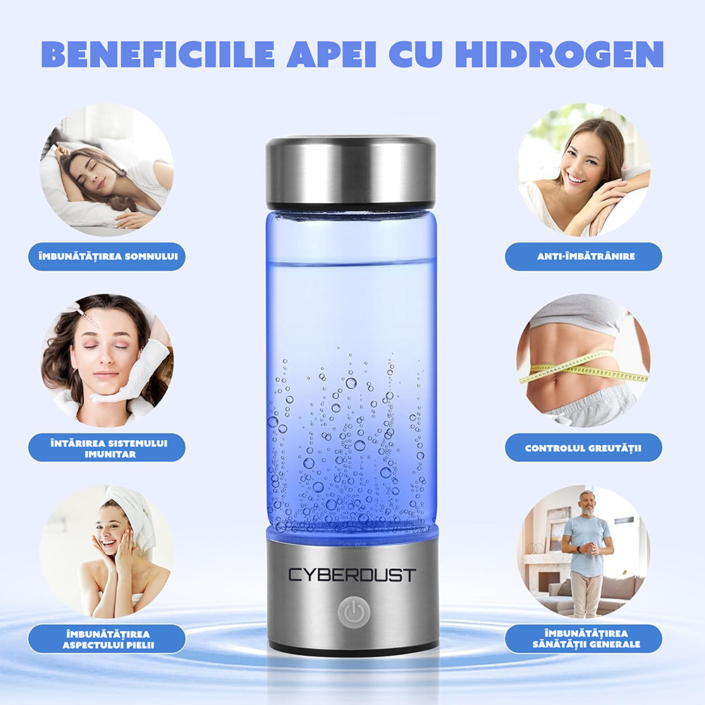 Sticla Generatoare de Apa cu Hidrogen CYBERDUST, Electroliza, Reincarcabila, USB, 420 ML, Portabila, Otel inoxidabil Sticla Generatoare de Apa cu Hidrogen CYBERDUST, Electroliza, Reincarcabila, USB, 420 ML, Portabila, Otel inoxidabil