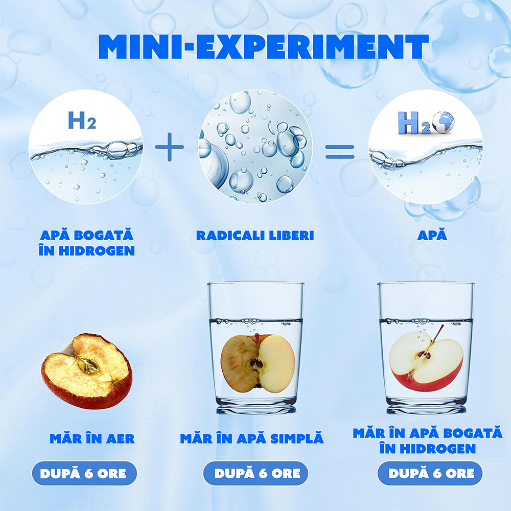 Reincărcabilă și Alimentată prin USB: Oferă flexibilitate și comoditate, fiind reincărcabilă prin USB pentru o utilizare continuă. Tehnologie Rapidă de Producție in 3 Minute: Generează apă bogată in hidrogen in doar 3 minute, ideală pentru eficiență și economie de timp.