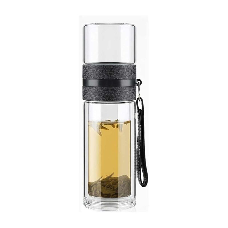 Foarte practica, acest recipient este format dintr-o sticla cu perete dublu (astfel incat sa va pastreze temperatura ceaiului o perioada indelungata), un paharut de sticla in care se pune Ceaiul ce urmeaza a fi infuzat (de asemenea, poate fi folosit si pentru a bea din el), un infuzor metalic ce separa cele 2 recipiente de sticla si o agatatoare de piele (in acest fel puteti lua sticla oriunde cu dumneavoastra!)