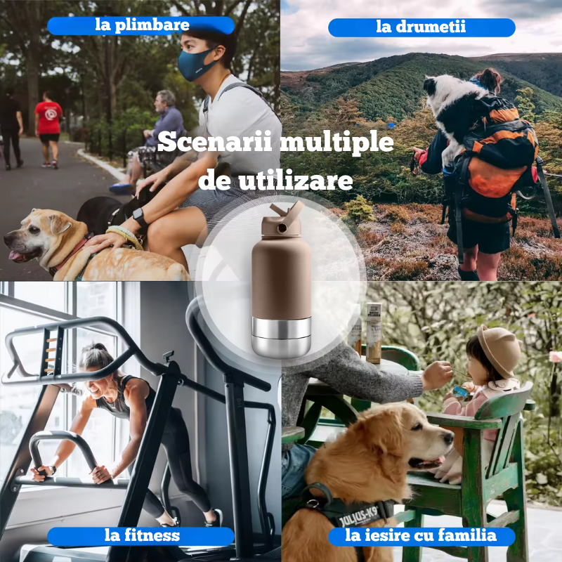 Aceasta sticla multifunctionala este un accesoriu esential pentru persoanele active si iubitorii de animale. Fie ca mergi la birou, intr-o drumetie, la sala sau te plimbi cu prietenul tau necuvantator, aceasta sticla iti asigura hidratarea si grija necesara.