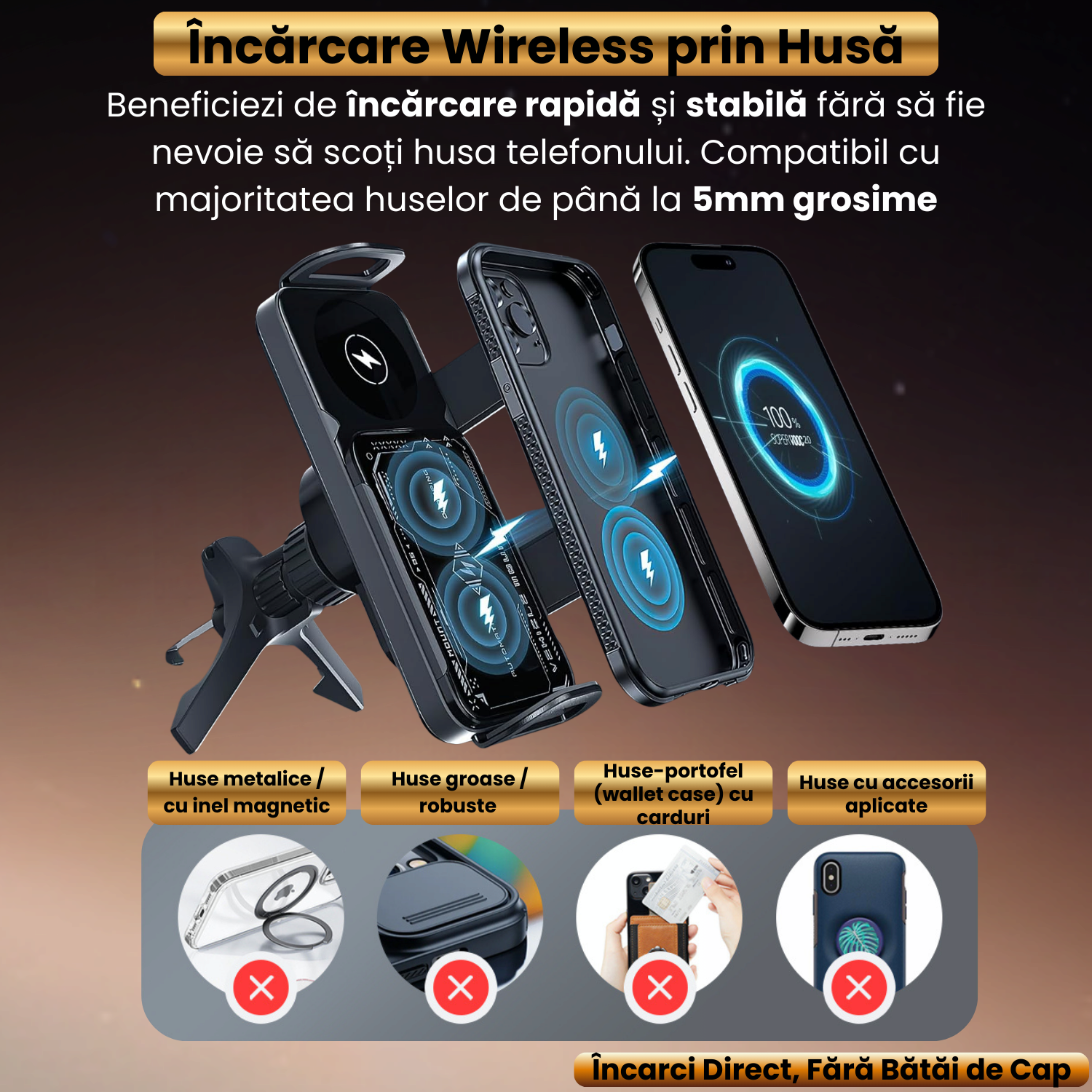 Nu mai pierzi timp scotand si punand husa telefonului de fiecare data. Suportul ofera incarcare rapida si stabila chiar si cu huse standard subtiri, astfel incat telefonul ramane protejat si tot timpul alimentat.