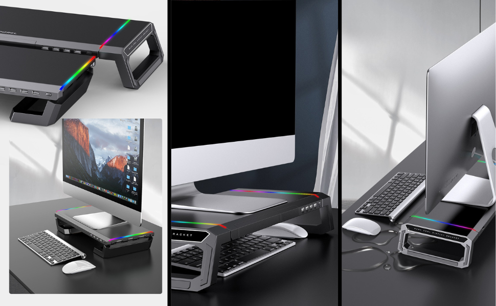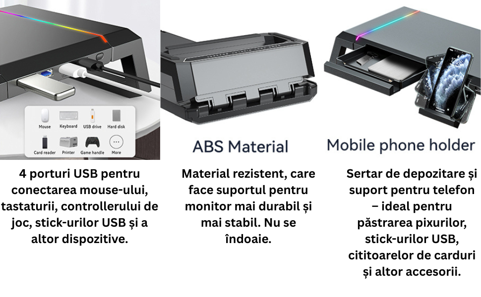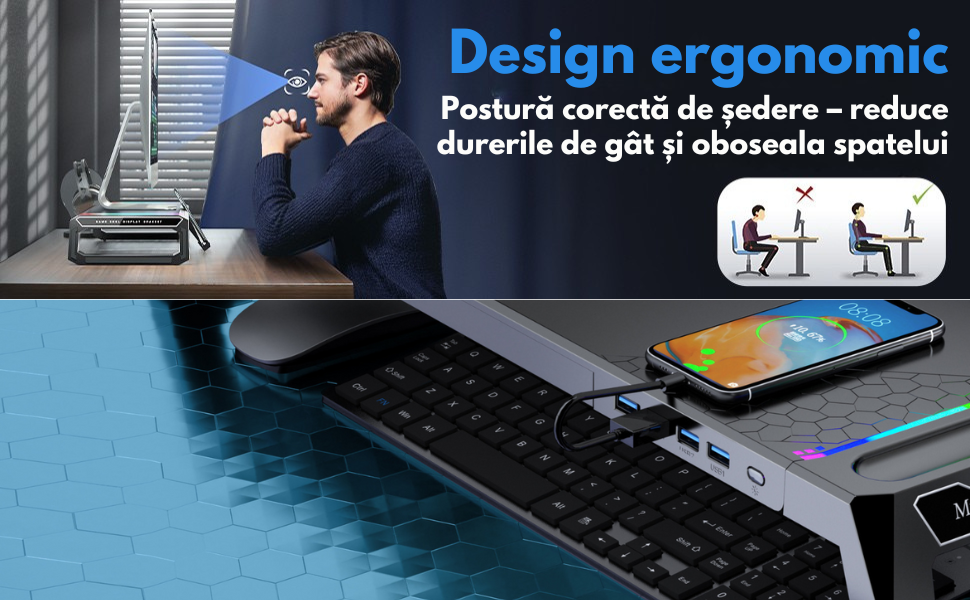 Acest suport ergonomic pentru monitor este solutia ideala pentru birourile moderne, fie ca esti gamer, lucrezi de acasa sau in office. Cu un design premium, iluminare RGB dinamica, conectivitate extinsa prin porturi USB si functii de organizare inteligente, produsul imbina perfect stilul cu functionalitatea.