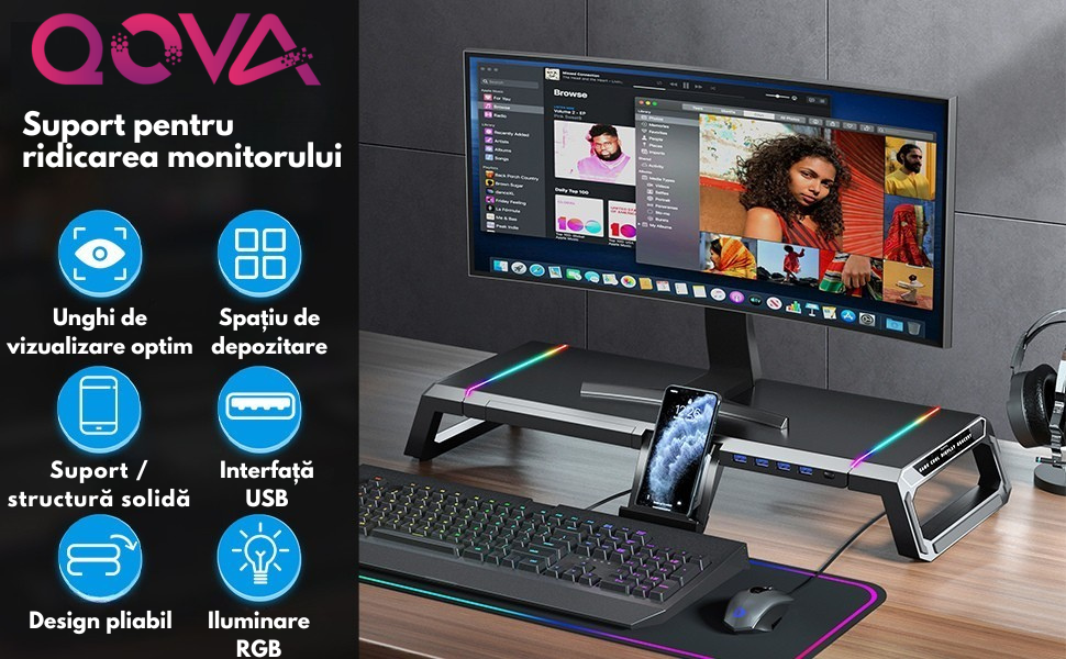 Suport Monitor si Laptop, Masuta Multifunctionala Qova®, cu lumini RGB reglabile si 4 Porturi USB, Tava Depozitare, Suport Telefon si Baza Antiderapanta, Ergonomic, Reglabil in 2 Moduri/Nivele, Organizator de birou Ideal pentru Gaming sau Birou, Negru