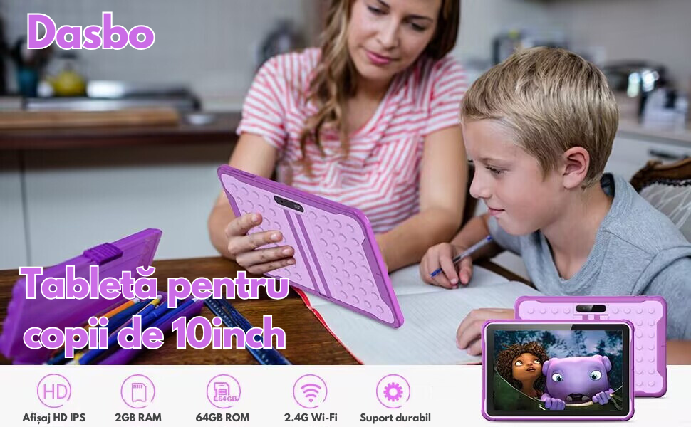 Tableta pentru copii de 10 inch Dasbo®, Sistem Android 13, 2GB RAM, 64GB ROM (extensibila la 128GB), Software pentru copii preinstalat, Ecran tactil cu sistem control parental, Bluetooth, WiFi, camera dubla 2MP + 8MP, Mov. Tableta pentru Copii Dasbo – Un Partener de Invatare si Distractie Sigura pentru Micutii Tai.