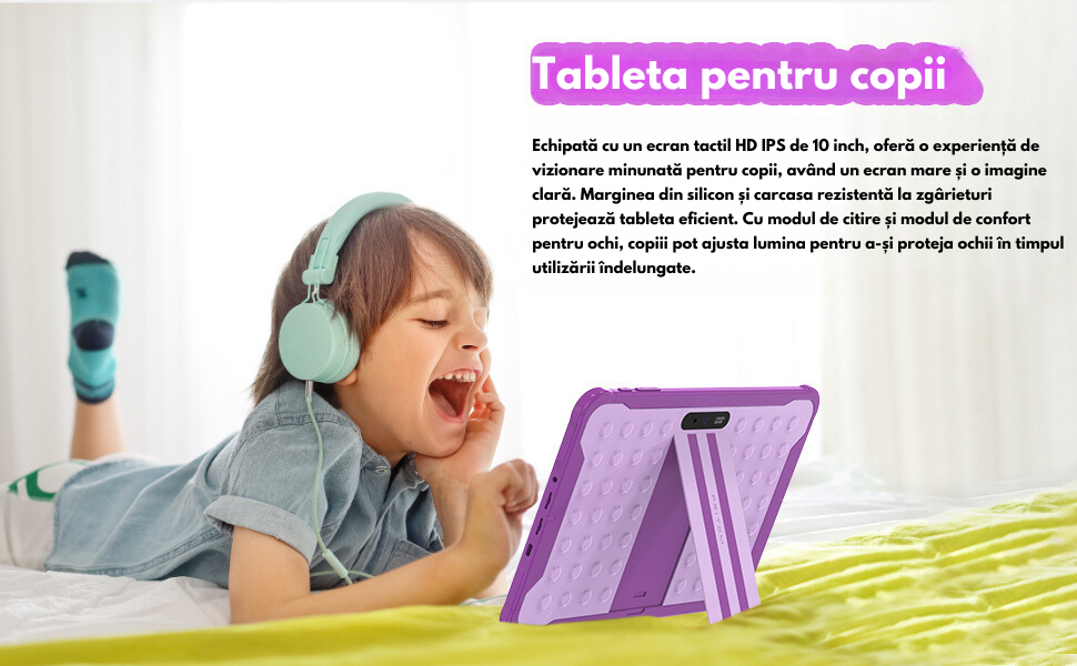 [Experienta vizuala confortabila] - Ecranul HD IPS de 10 inch ofera o calitate buna a imaginii la unghiuri complete, cu o rezolutie de 1280x800. In plus, modurile „Eye Comfort” si „Read Mode” protejeaza ochii copiilor, reducand impactul luminii slabe din jur. Cu doar un clic, ecranul intra in aceste moduri: modul de confort pentru ochi va inmuia lumina, iar modul de citire va transforma ecranul in alb-negru. Copiii se pot bucura de o experienta vizuala confortabila.