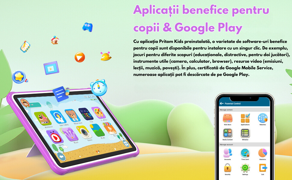 - Control Parental – Aplicatia Pritom Kids preinstalata ofera un sistem robust de control parental, care permite limitarea timpului de utilizare si monitorizarea aplicatiilor accesate de copii.