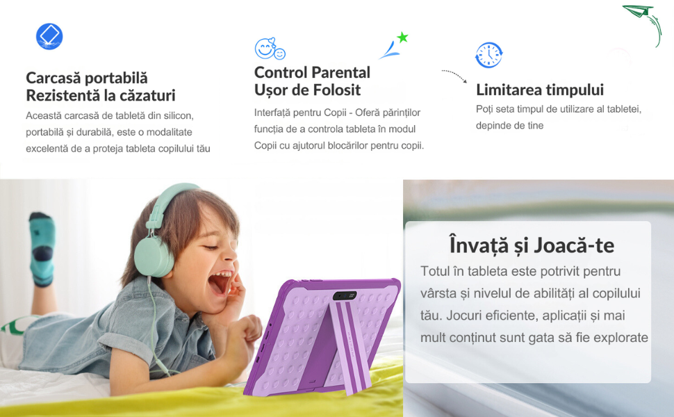 - Siguranta la Utilizare: Cu sistemul avansat de control parental si designul anti-soc, tableta este creata pentru a fi atat sigura, cat si durabila, ideala pentru uzul zilnic al copiilor.