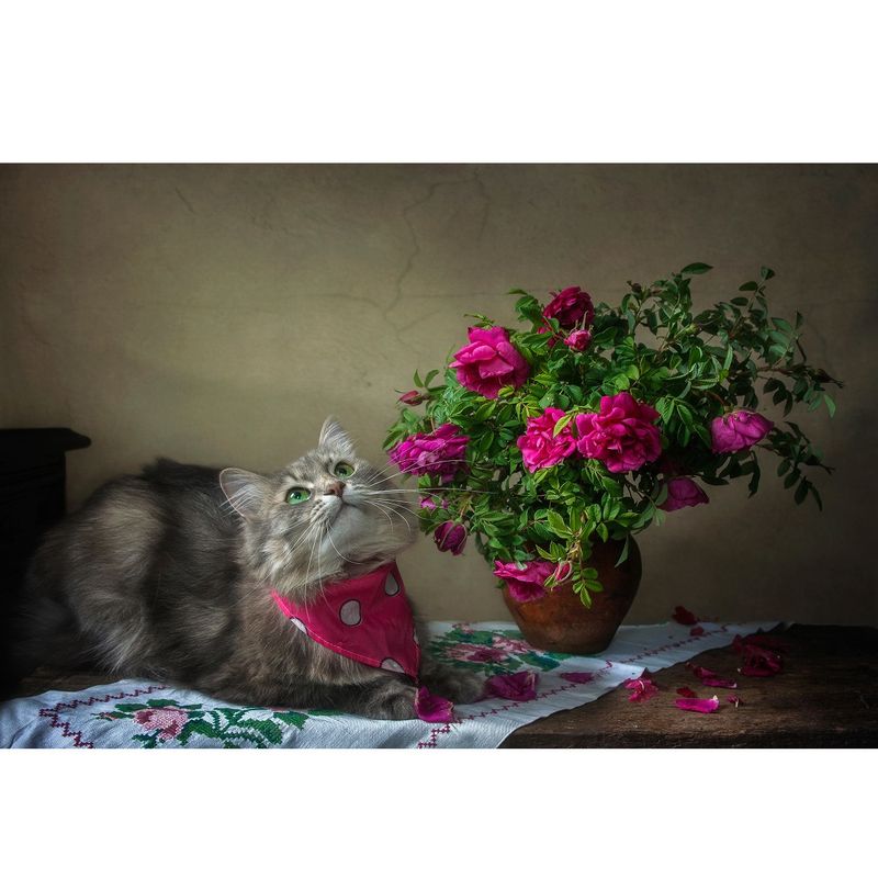 Tablou Canvas, Flori, animale, pisica, vaza, natura statica, 80x50 cm, Rama lemn, Multicolor Tablou Canvas, Flori, animale, pisica, vaza, natura statica, 80x50 cm, Rama lemn, Multicolor