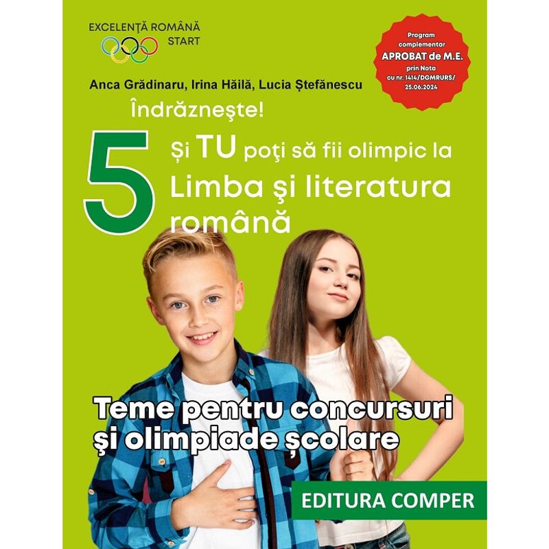 Indrazneste! si tu poti sa fii olimpic la limba si literatura romana. teme pentru concursuri si olimpiade scolare. clasa a v-a dragi elevi, vreti sa atingeti excelenta in studiul limbii si literaturii romane? in acest ghid nou al pregatirii pentru olimpiadele scolare veti gasi cele mai utile teste de antrenament pentru olimpiada de limba si literatura romana, pentru olimpiada interdisciplinara (limba romana si religie) cultura si spiritualitate romaneasca si pentru olimpiada lectura ca abilitate de viata. testele de antrenament pentru performanta acopera nu doar programa scolara standard, ci si subiecte de dificultate sporita, menite sa va stimuleze gandirea critica, creativitatea si capacitatea de analiza. fiecare test este proiectat pentru a evalua atat cunostintele teoretice solide, cat si abilitatea de a le aplica in situatii noi si provocatoare. veti avea ocazia sa va perfec-tionati analiza textelor literare, sa va imbunatatiti tehnicile de argumentare si sa va dezvoltati abilitatile de folosire a limbii romane. pentru a va ajuta in procesul de invatare, fiecare test este insotit de un barem detaliat si de explicatii, care va vor permite sa intelegeti in profunzime cerintele, sa evitati capcanele frecvente si sa va evaluati progresul in mod obiectiv. indrazniti si veti fi cei mai buni din romania! mult succes! avem incredere in voi! - autoarele