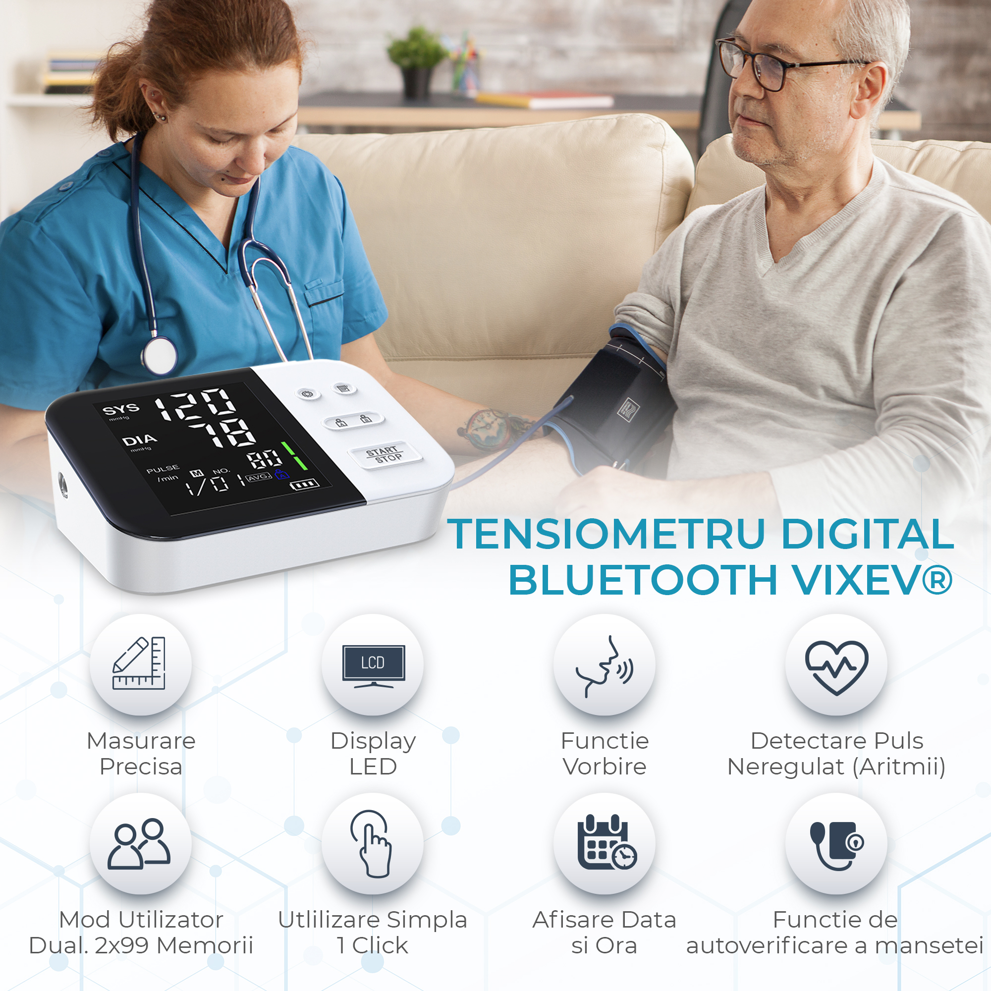 Tensiometru de Brat Digital Vixev, Bluetooth, Detectare Puls Neregulat, Auto Masurare Tensiune Sistolica/Diastolica, alb Tensiometru de Brat Digital Vixev, Bluetooth, Detectare Puls Neregulat, Auto Masurare Tensiune Sistolica/Diastolica, alb