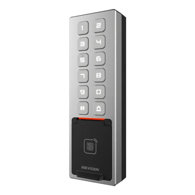 Terminal control acces cu functii de interfonie ce suporta diferite metode de autentificare (card, PIN, amprenta, bluetooth). Carduri suportate M1. Distanta mica de citire a cardului de 0 ~ 4 cm. Buzzer incorporat. Posibilitate de control cu ajutorul aplicatiei de mobil Hik-Connect.