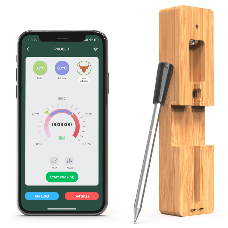 Termometru inteligent de bucatarie Esprodys, pentru orice tip de carne, aplicatie mobila IOS si Android, conectare Bluetooth, sonda din otel inoxidabil, rezistent la apa si caldura, Negru