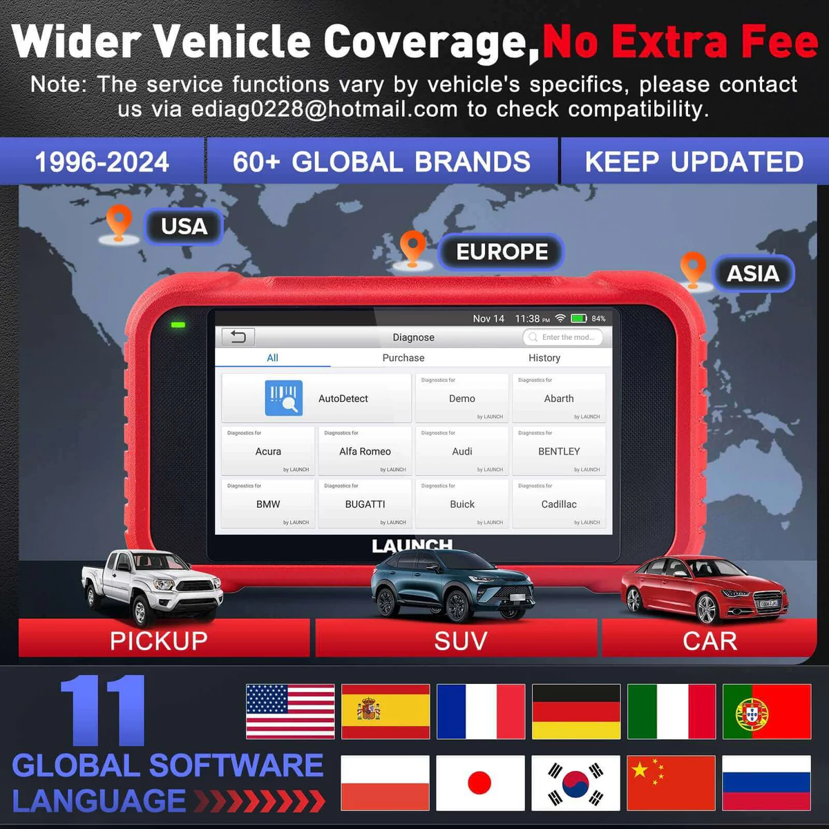 Compatibilitate extinsa: Suporta peste 85 de marci auto la nivel global, acoperind vehicule fabricate între 1996 si prezent. Este compatibil cu protocoalele OBD2, EOBD, JOBD si CAN, fiind potrivit pentru autoturisme pe benzina si diesel (12V), SUV-uri, camionete si vehicule usoare.