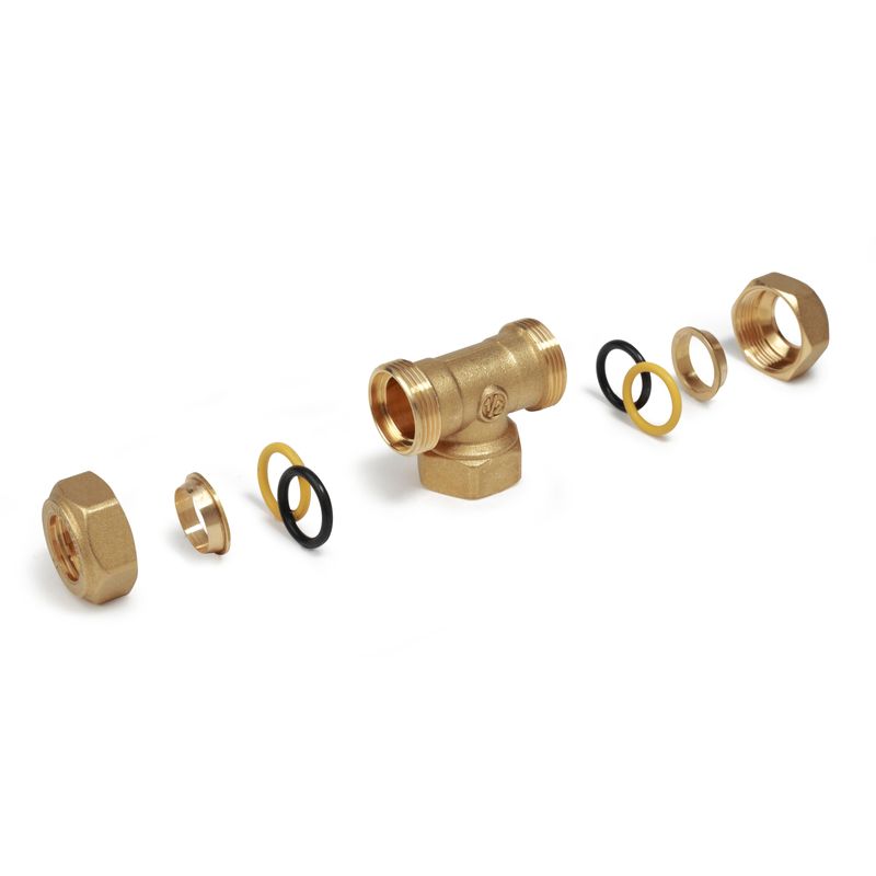 Teu de compresie din alama, cu filet interior 3/4" x 22 mm, destinat tevilor din cupru. Este utilizat in instalatii de incalzire, racire, alimentare cu apa, dar si in sisteme de distributie a gazelor si hidrocarburilor lichide nepericuloase. Fitingul este conform standardului EN 1254-2 si asigura o conexiune mecanica sigura, etansa si durabila intre tevile de cupru si alte componente filetate.