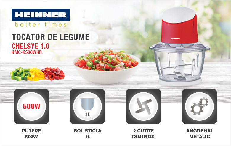 Tocator de legume Heinner HMC-K500WHR, 500W, 1 l, 2 cutite din inox, angrenaj metalic Tocator de legume Heinner HMC-K500WHR, 500W, 1 l, 2 cutite din inox, angrenaj metalic