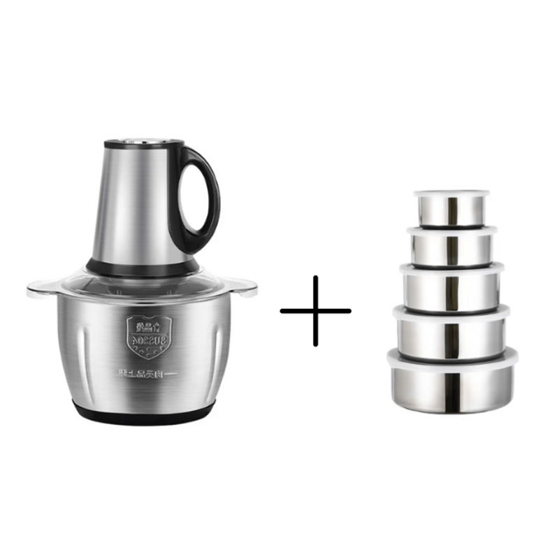 Tocator electric, inox, 4 lame din otel inoxidabil, recipient din inox, 2 L + set 5 caserole din inox cu capac